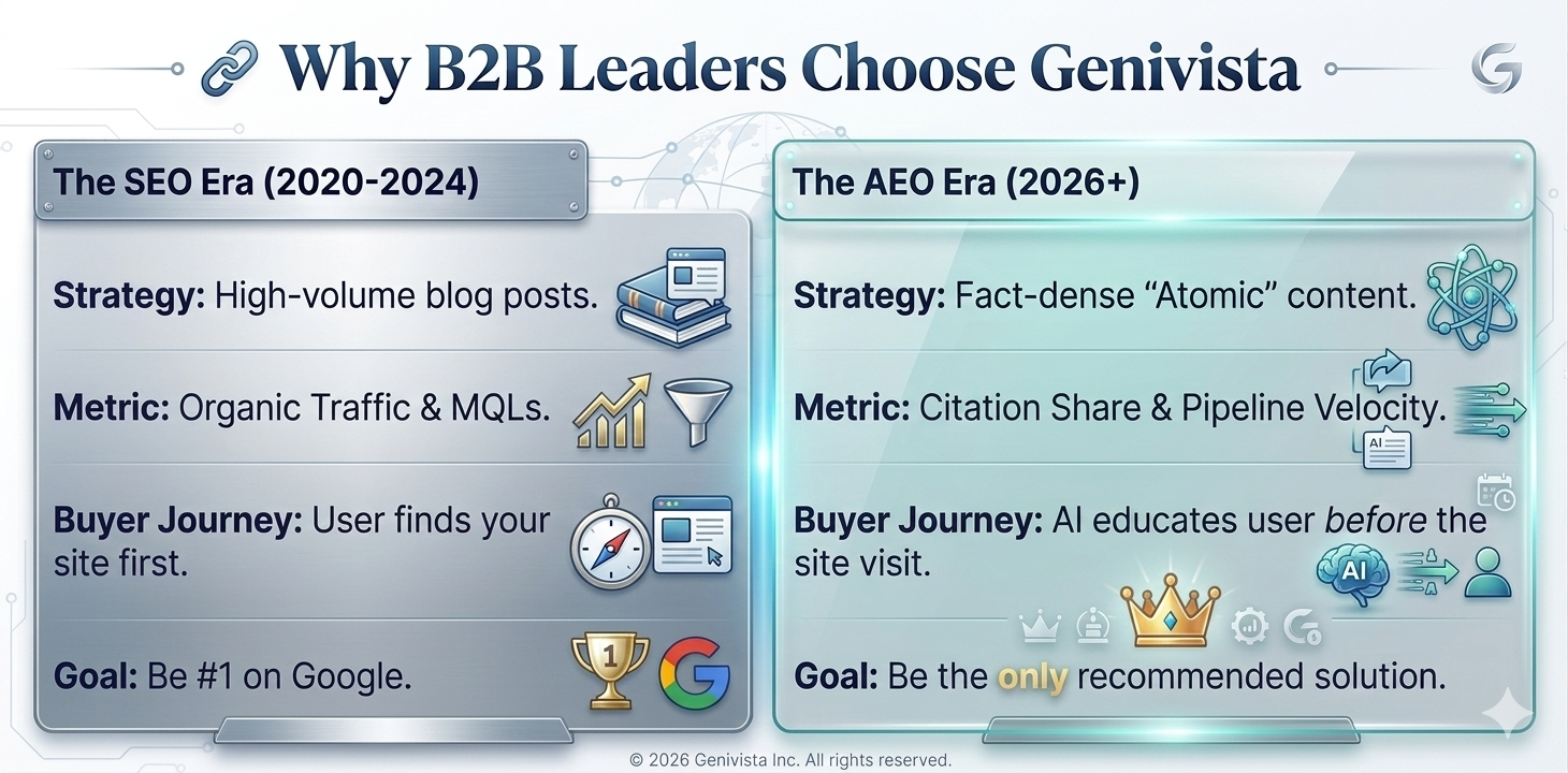 In this moment, the AI doesn't give them a list of links. It gives them a recommendation. Genivista ensures that recommendation is you.